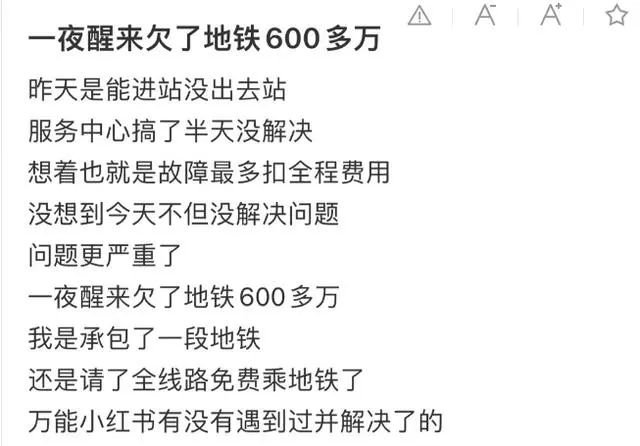但隨后想起前一天的情況后,該網(wǎng)友也是意識(shí)到了問題,這是地鐵的收費(fèi)的系統(tǒng)出現(xiàn)了問題。此前新聞也爆出過此類問題,刷公交,地鐵等不斷扣費(fèi)的情況。于是不再慌張,并把情況發(fā)到了小紅書之上尋求幫助。而自己也前往地鐵部門進(jìn)行協(xié)商。